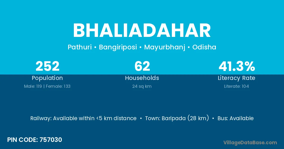 Baripada (28 km) is the nearest town to Bhaliadahar village for major economic activities and is located approximately 28 km away.
