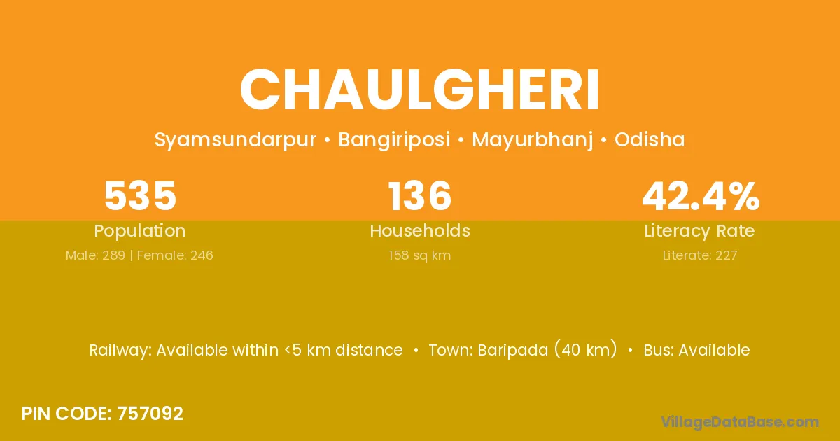 Baripada (40 km) is the nearest town to Chaulgheri village for major economic activities and is located approximately 40 km away.