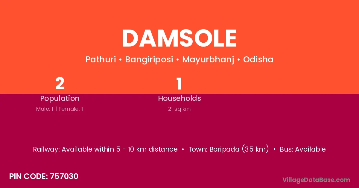Baripada (35 km) is the nearest town to Damsole village for major economic activities and is located approximately 35 km away.