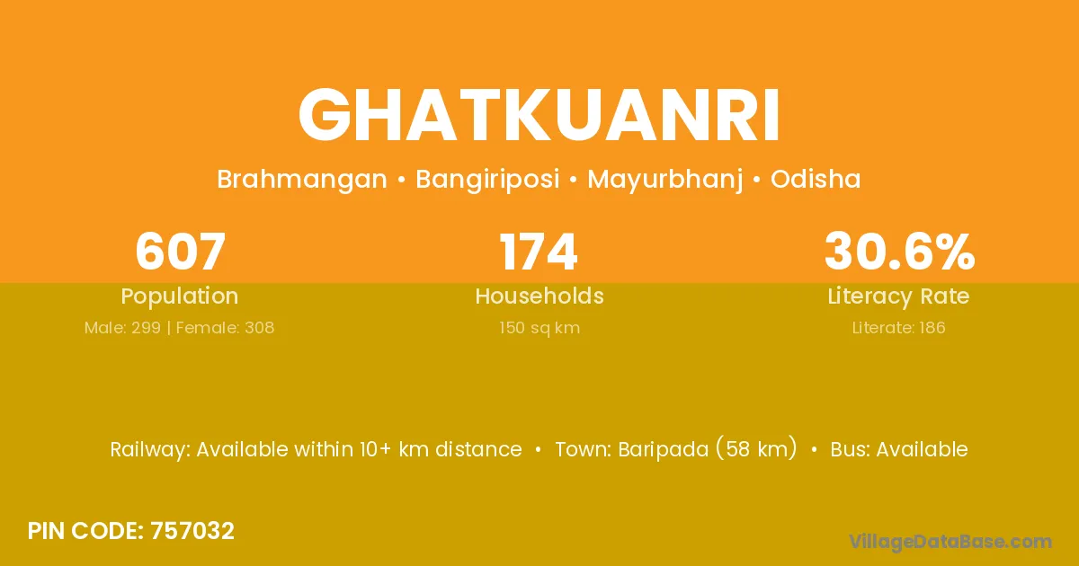 Baripada (58 km) is the nearest town to Ghatkuanri village for major economic activities and is located approximately 58 km away.
