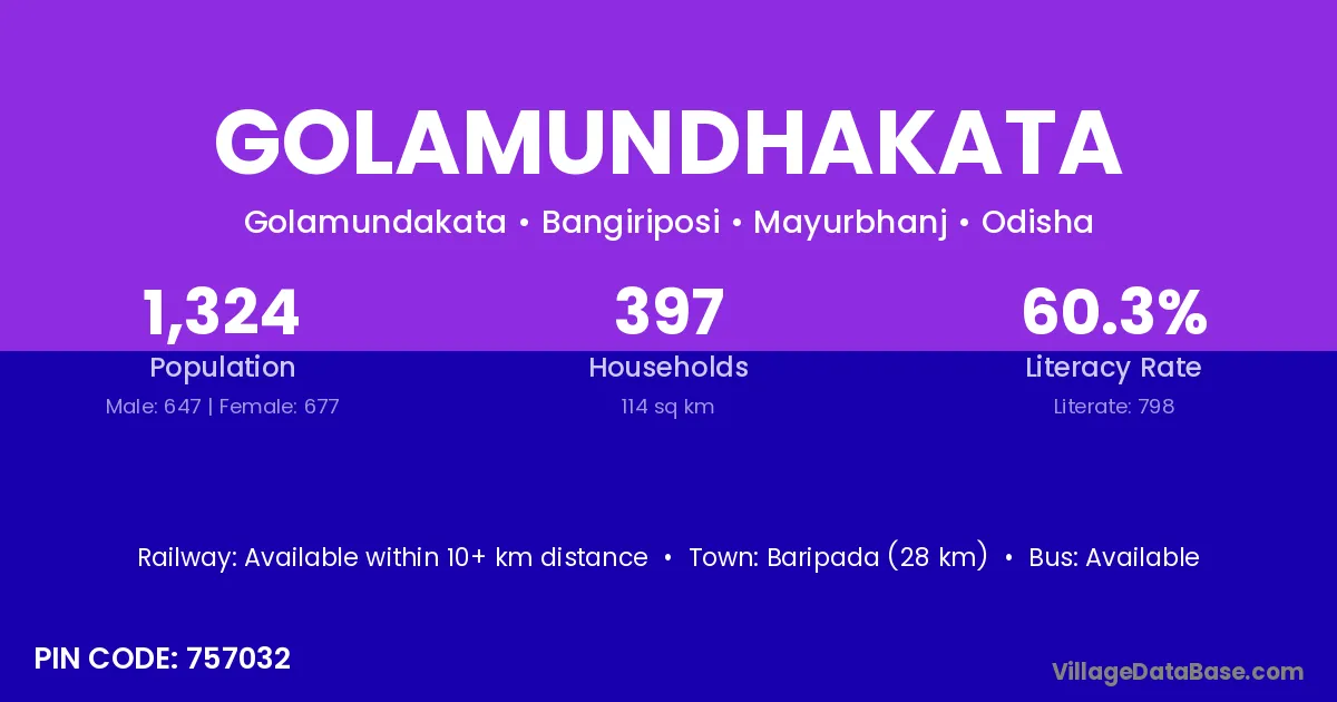Baripada (28 km) is the nearest town to Golamundhakata village for major economic activities and is located approximately 28 km away.