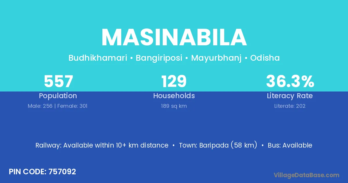 Baripada (58 km) is the nearest town to Masinabila village for major economic activities and is located approximately 58 km away.