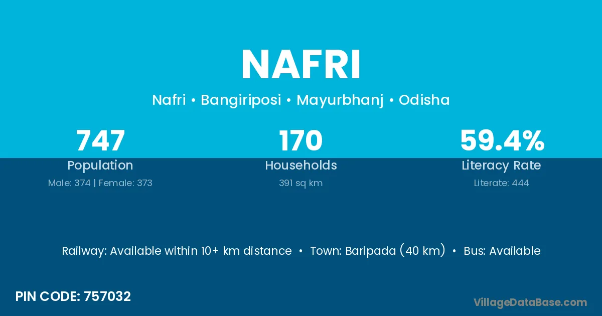 Baripada (40 km) is the nearest town to Nafri village for major economic activities and is located approximately 40 km away.