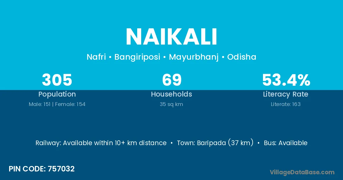 Baripada (37 km) is the nearest town to Naikali village for major economic activities and is located approximately 37 km away.
