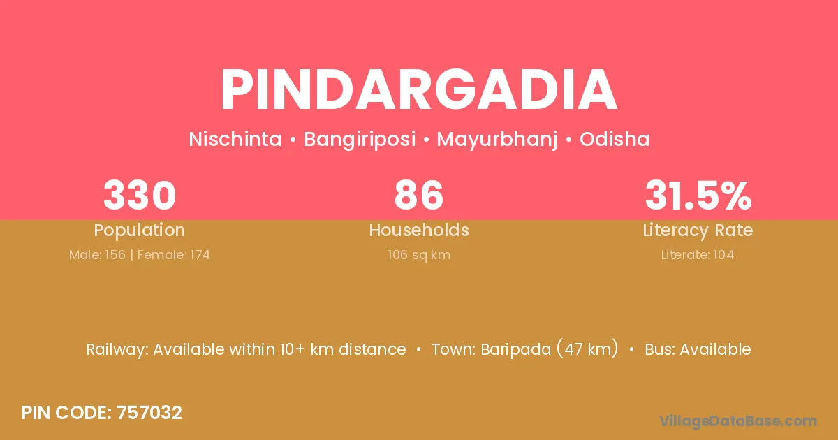 Baripada (47 km) is the nearest town to Pindargadia village for major economic activities and is located approximately 47 km away.