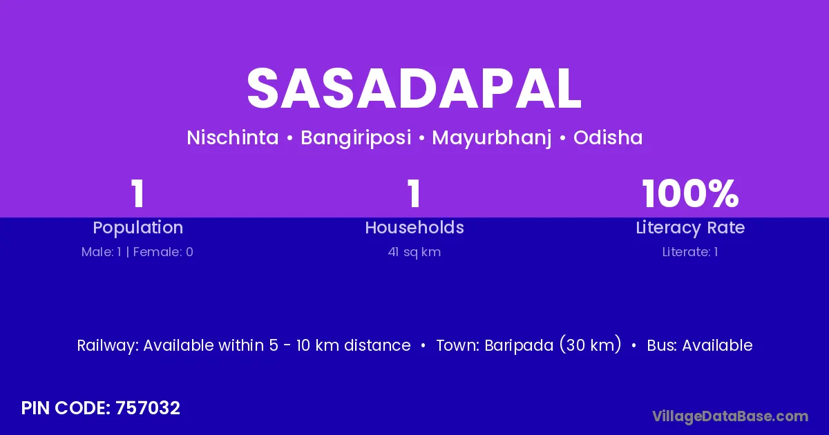 Baripada (30 km) is the nearest town to Sasadapal village for major economic activities and is located approximately 30 km away.