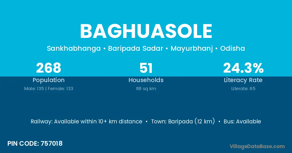 Baripada (12 km) is the nearest town to Baghuasole village for major economic activities and is located approximately 12 km away.