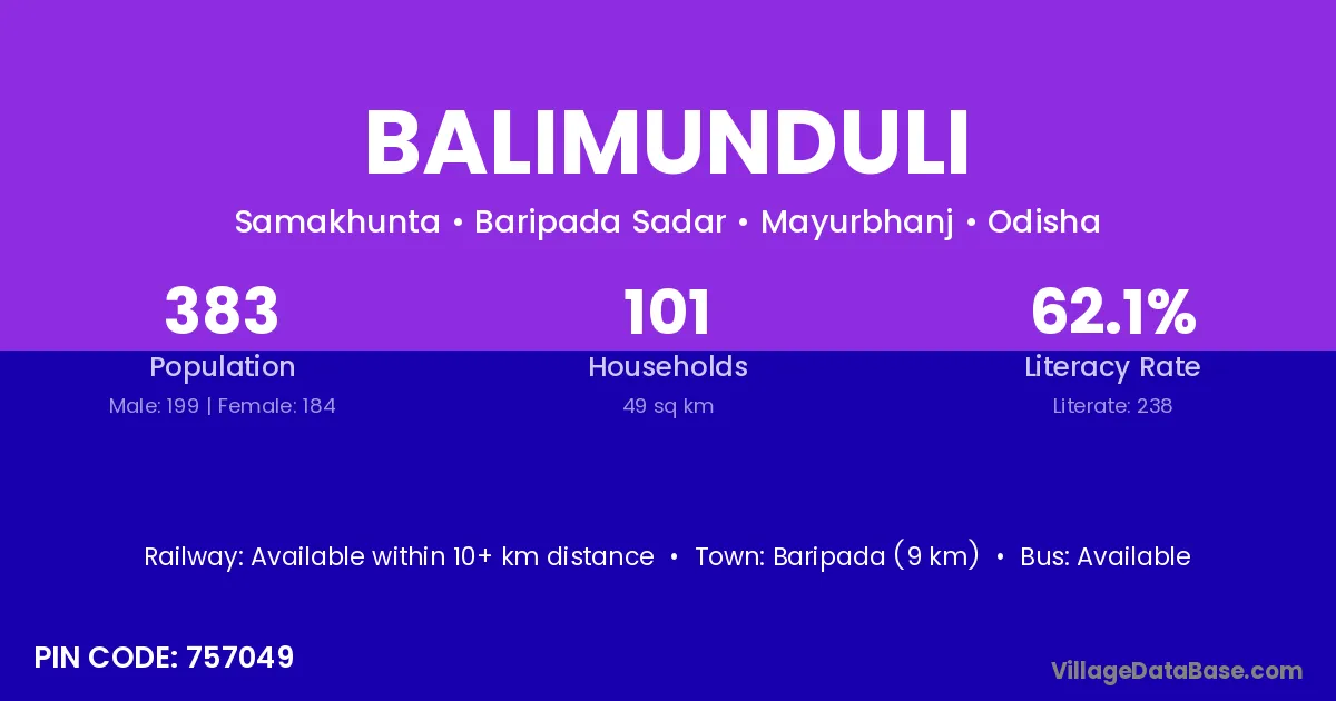Baripada (9 km) is the nearest town to Balimunduli village for major economic activities and is located approximately 9 km away.