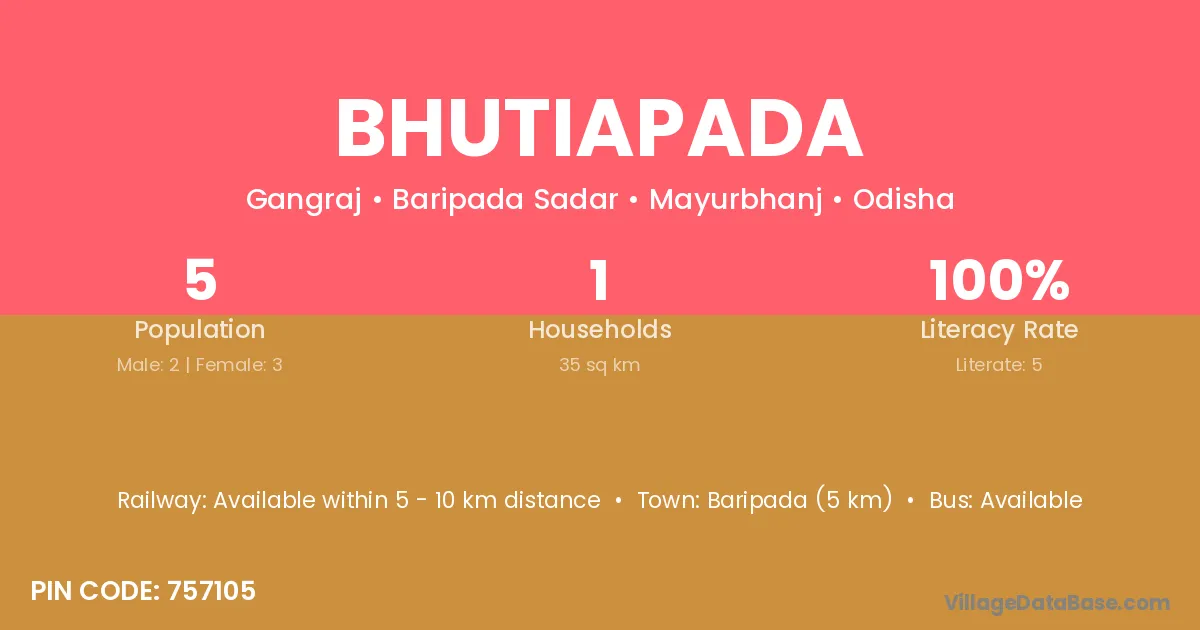 Bhutiapada village has a total population of 5 people, of which 2 are males and 3 are females.