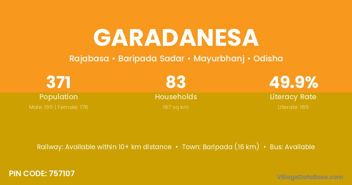 Baripada (16 km) is the nearest town to Garadanesa village for major economic activities and is located approximately 16 km away.