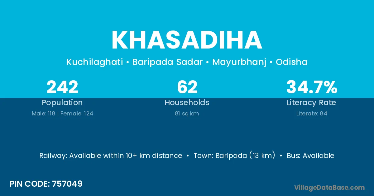 Baripada (13 km) is the nearest town to Khasadiha village for major economic activities and is located approximately 13 km away.