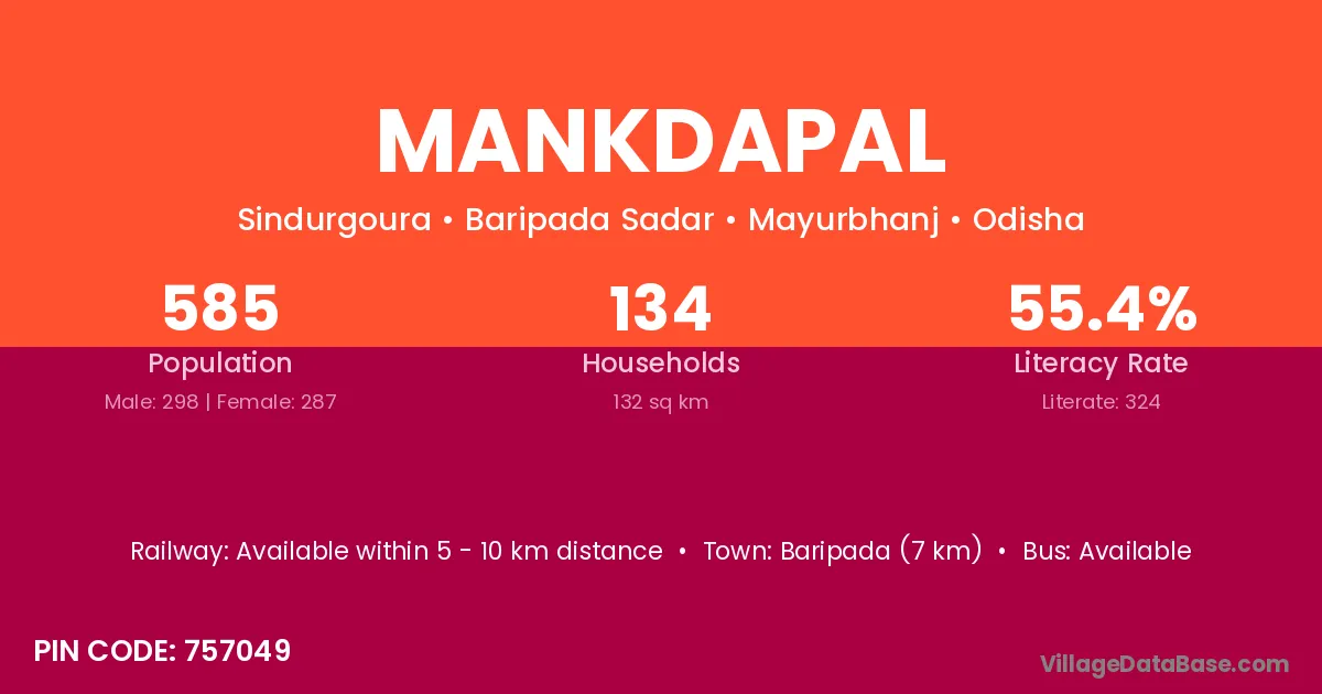 Baripada (7 km) is the nearest town to Mankdapal village for major economic activities and is located approximately 7 km away.