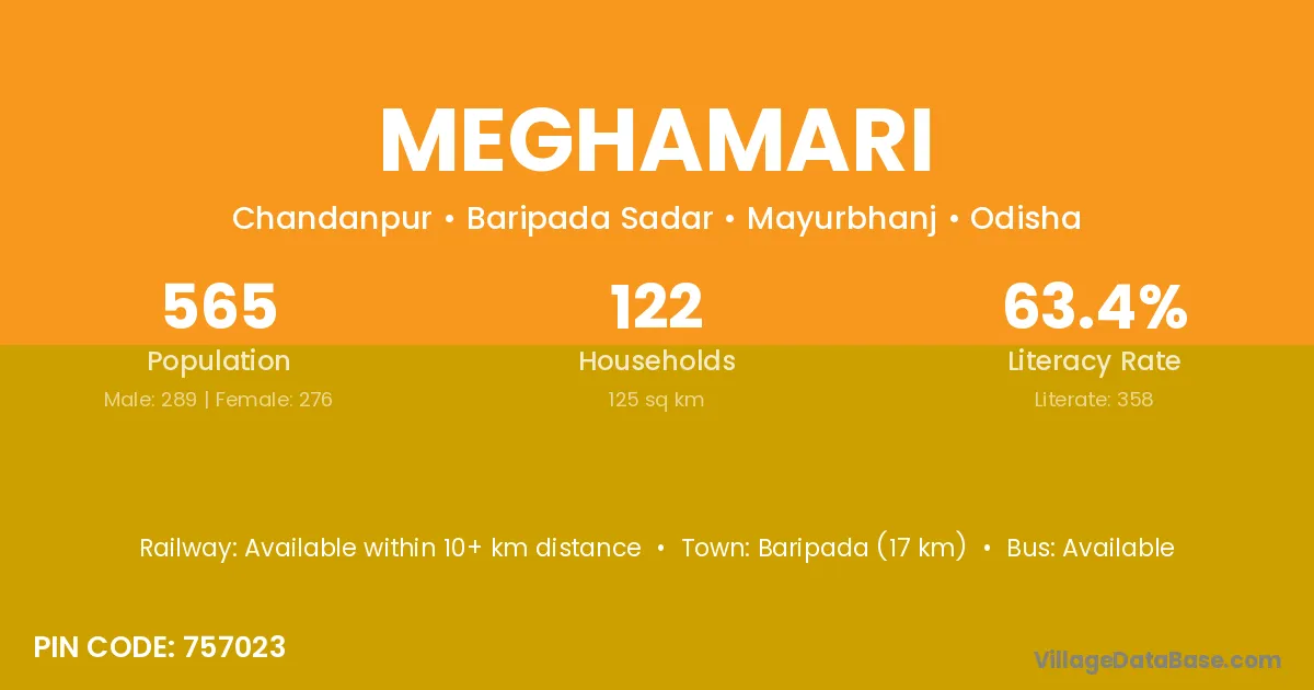 Baripada (17 km) is the nearest town to Meghamari village for major economic activities and is located approximately 17 km away.