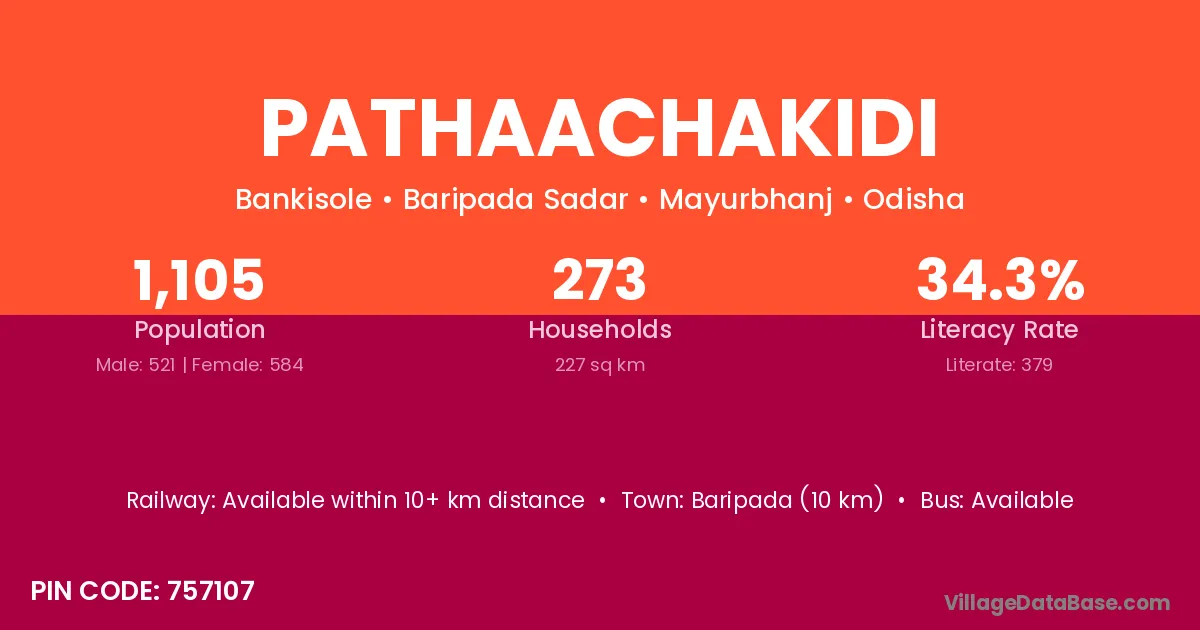 Baripada (10 km) is the nearest town to Pathaachakidi village for major economic activities and is located approximately 10 km away.