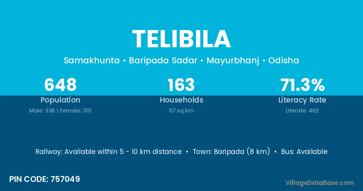 Baripada (8 km) is the nearest town to Telibila village for major economic activities and is located approximately 8 km away.