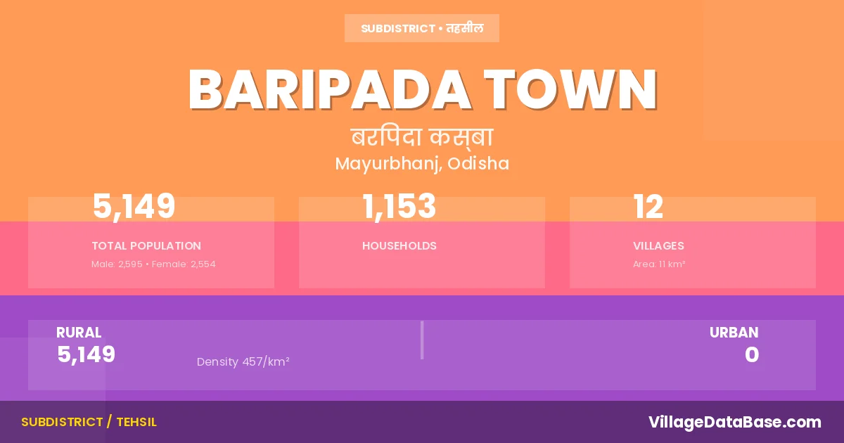 According to the 2011 census The total area of Baripada Town Tehsil is 11 km², with a population of 5149 people. The population density is 457 inhabitants per square kilometre, and there are approximately 1153 houses in the sub district.