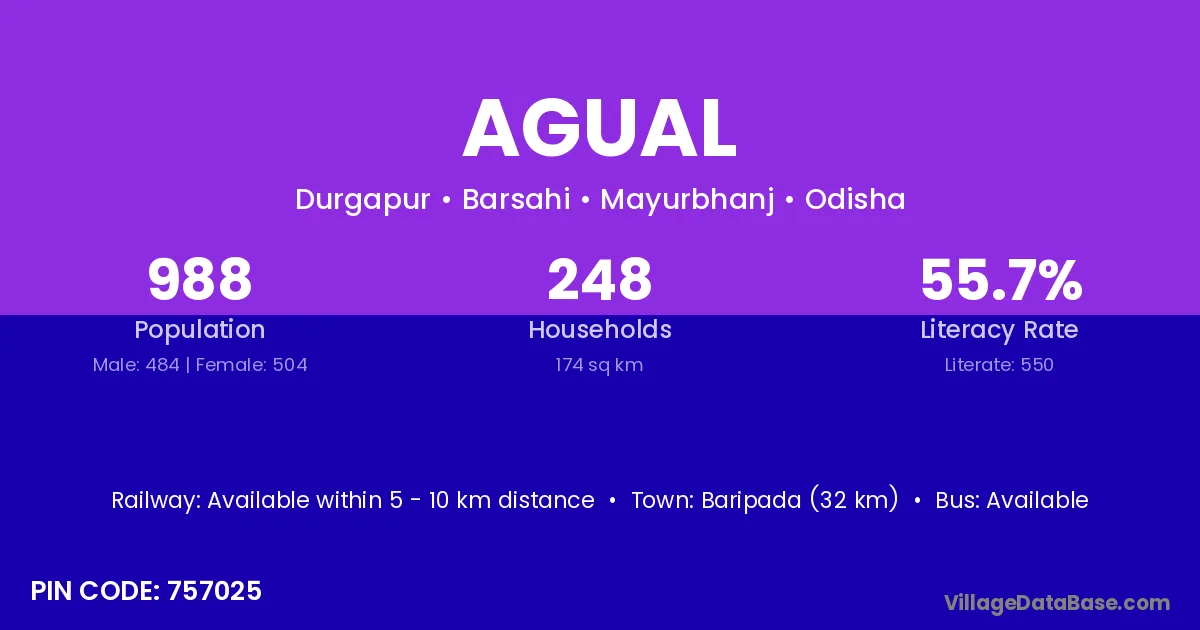 Baripada (32 km) is the nearest town to Agual village for major economic activities and is located approximately 32 km away.