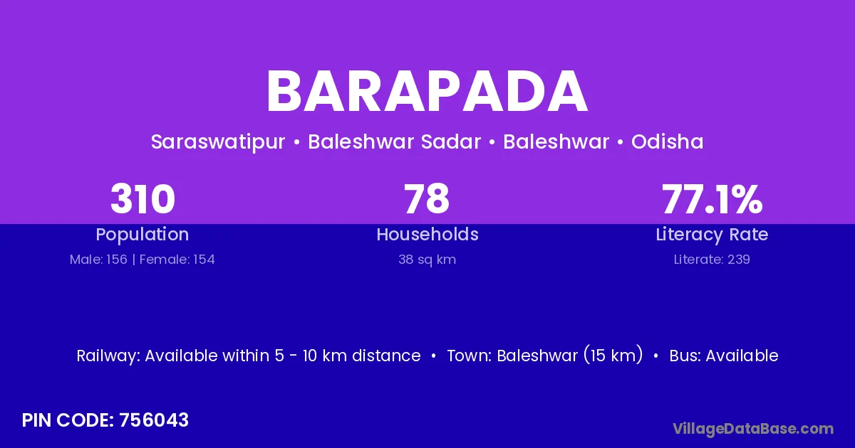 Baripada (22 km) is the nearest town to Barapada village for major economic activities and is located approximately 22 km away.