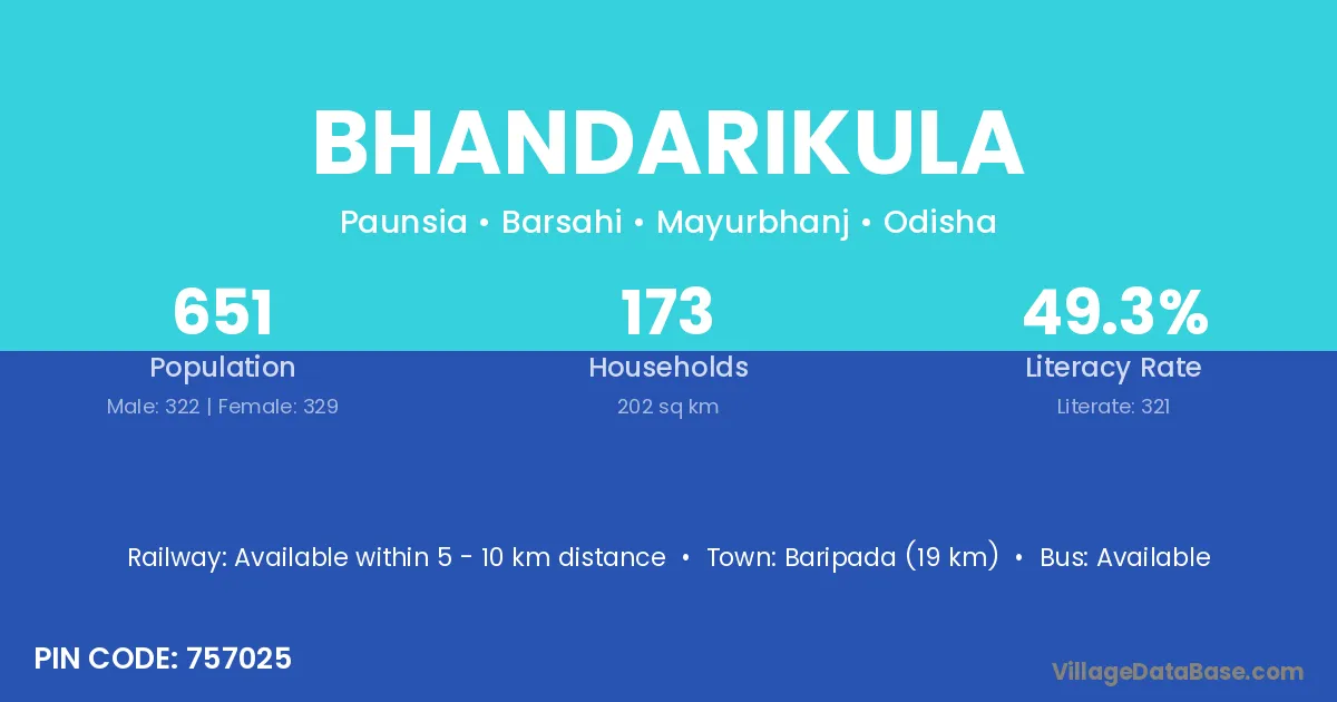 Baripada (19 km) is the nearest town to Bhandarikula village for major economic activities and is located approximately 19 km away.