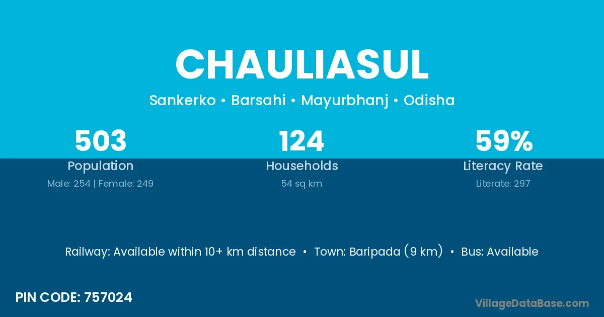 Baripada (9 km) is the nearest town to Chauliasul village for major economic activities and is located approximately 9 km away.