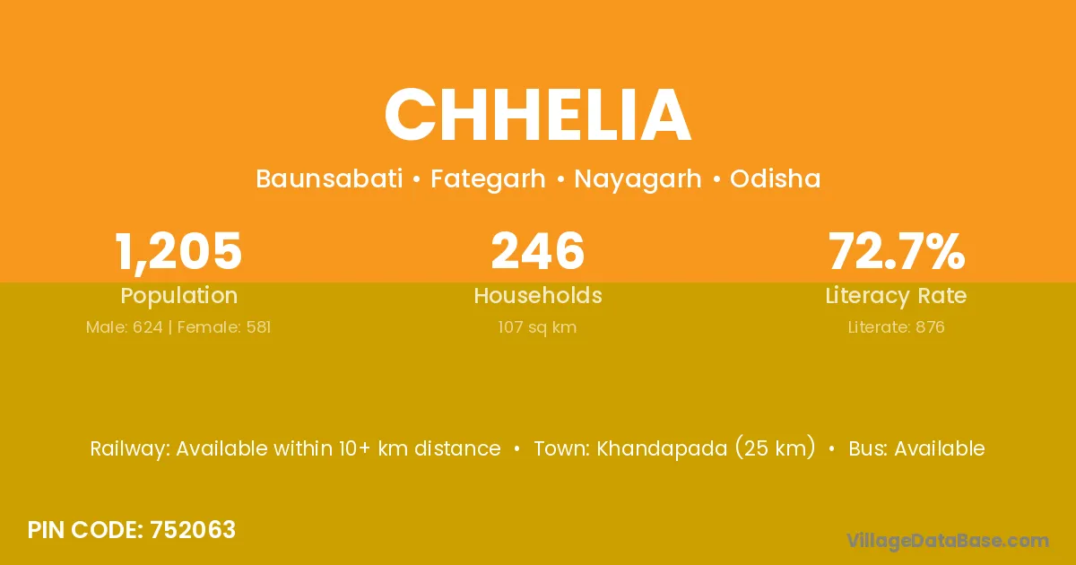 Baripada (31 km) is the nearest town to Chhelia village for major economic activities and is located approximately 31 km away.