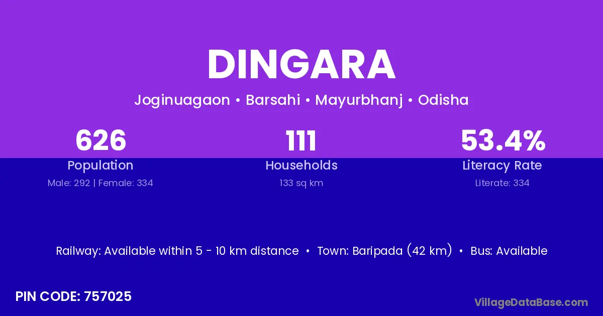 Baripada (42 km) is the nearest town to Dingara village for major economic activities and is located approximately 42 km away.