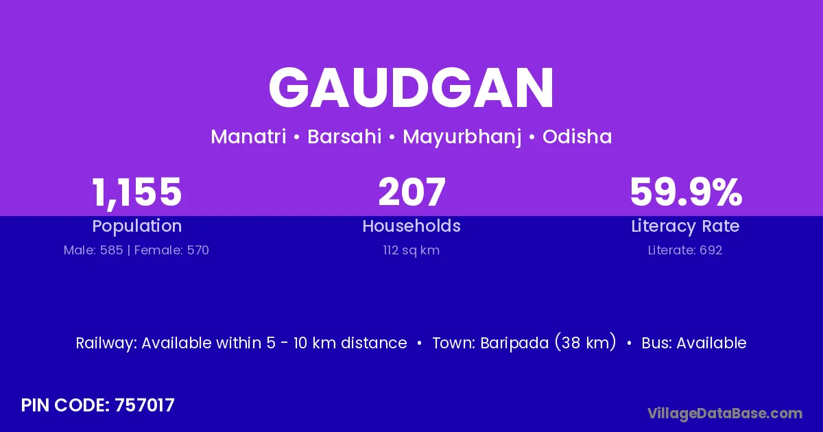 Baripada (38 km) is the nearest town to Gaudgan village for major economic activities and is located approximately 38 km away.