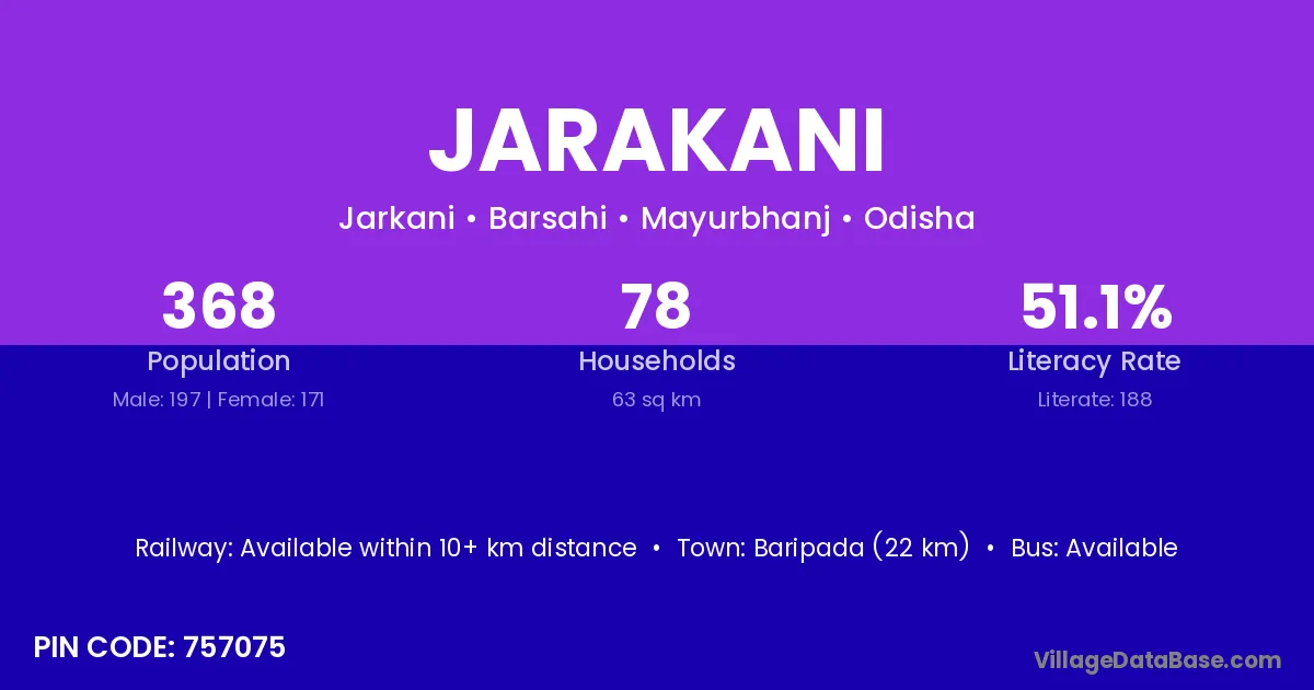 Baripada (22 km) is the nearest town to Jarakani village for major economic activities and is located approximately 22 km away.