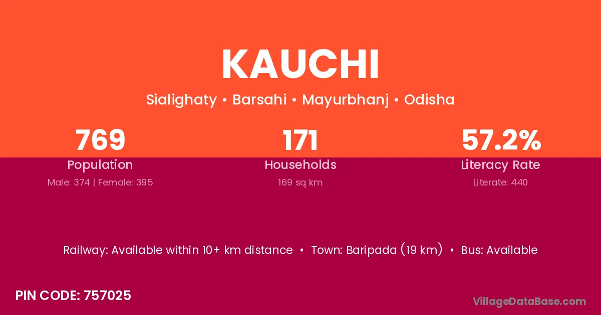 Baripada (19 km) is the nearest town to Kauchi village for major economic activities and is located approximately 19 km away.