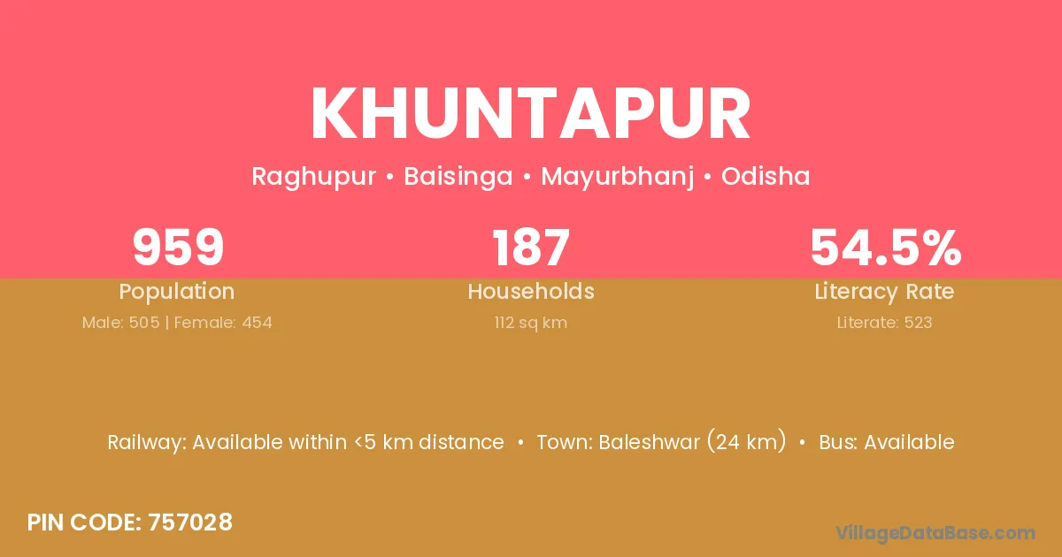 Baripada (47 km) is the nearest town to Khuntapur village for major economic activities and is located approximately 47 km away.