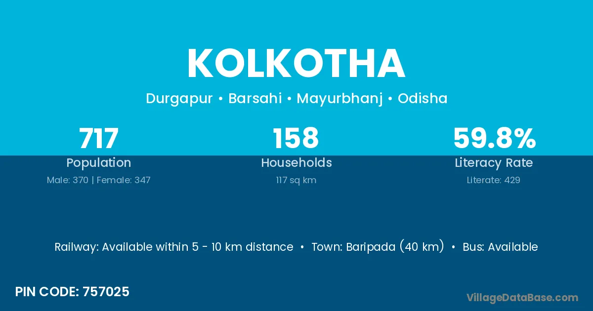 Baripada (40 km) is the nearest town to Kolkotha village for major economic activities and is located approximately 40 km away.