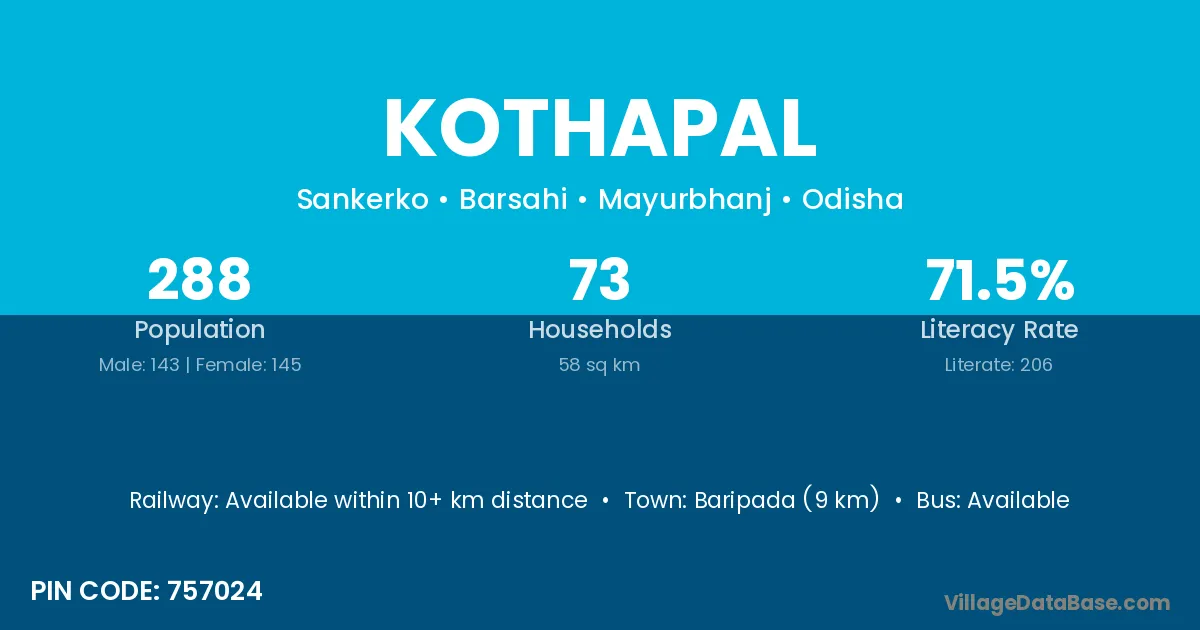 Baripada (9 km) is the nearest town to Kothapal village for major economic activities and is located approximately 9 km away.
