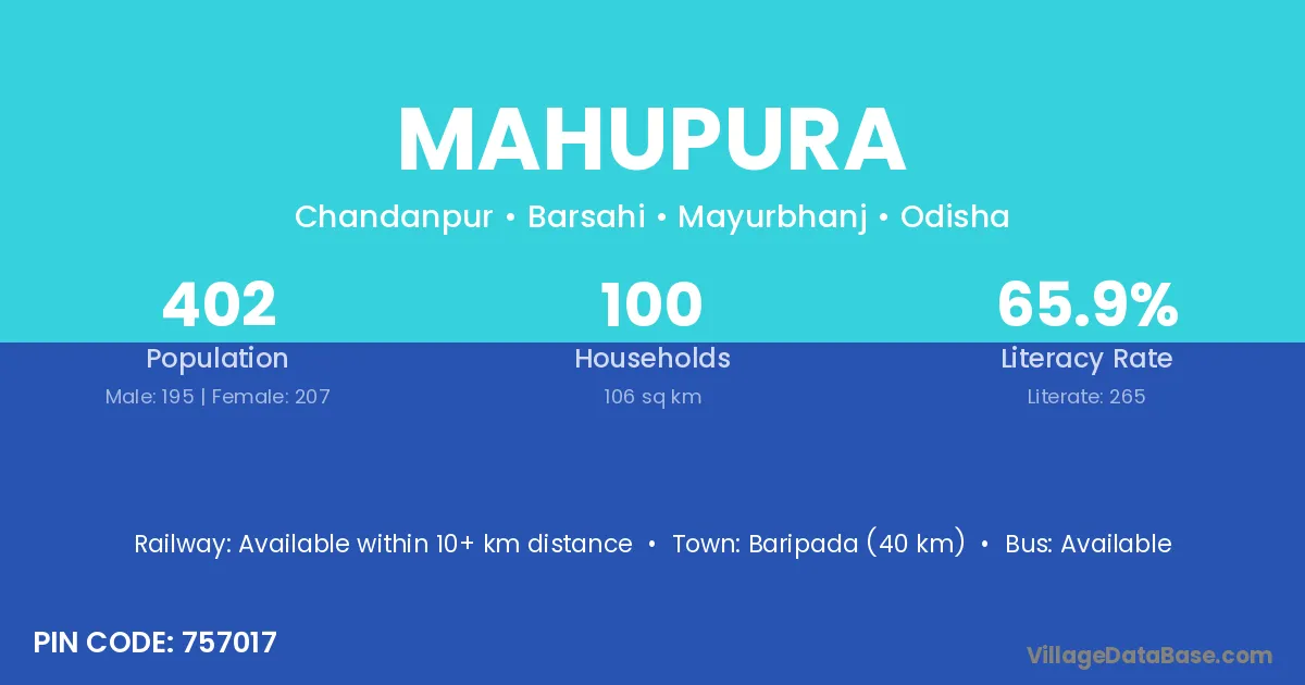 Baripada (40 km) is the nearest town to Mahupura village for major economic activities and is located approximately 40 km away.