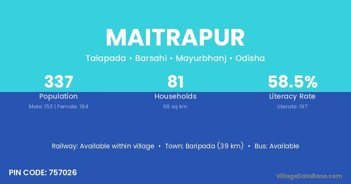 Baripada (39 km) is the nearest town to Maitrapur village for major economic activities and is located approximately 39 km away.