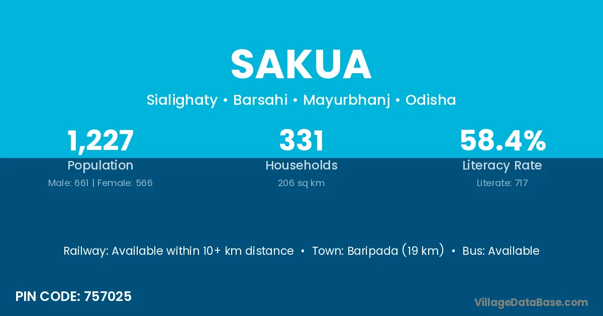 Baripada (19 km) is the nearest town to Sakua village for major economic activities and is located approximately 19 km away.