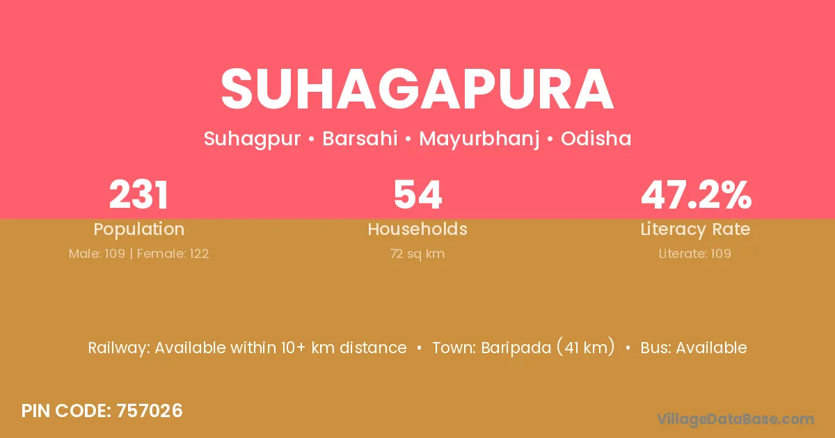 Baripada (41 km) is the nearest town to Suhagapura village for major economic activities and is located approximately 41 km away.