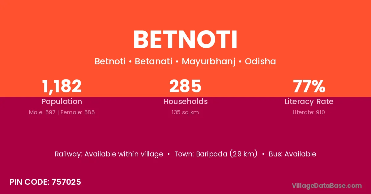 Baripada (29 km) is the nearest town to Betnoti village for major economic activities and is located approximately 29 km away.