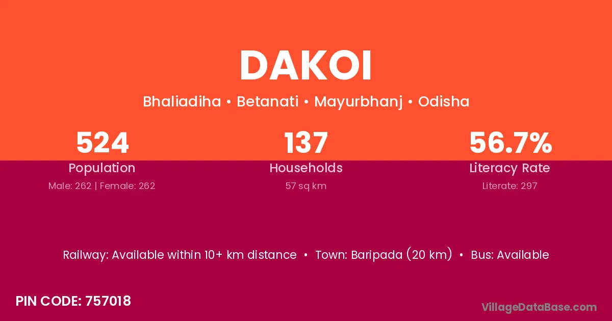 Dakoi village has a total population of 524 people, of which 262 are males and 262 are females.