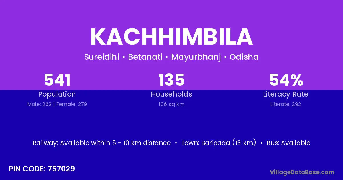 Baripada (13 km) is the nearest town to Kachhimbila village for major economic activities and is located approximately 13 km away.