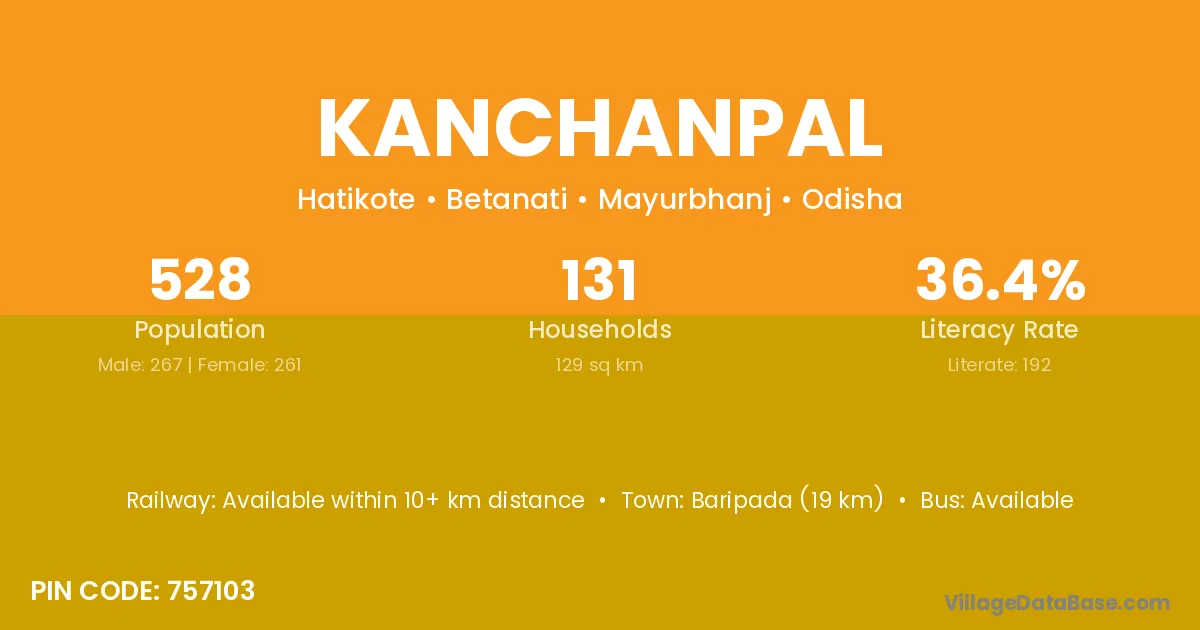 Baripada (19 km) is the nearest town to Kanchanpal village for major economic activities and is located approximately 19 km away.
