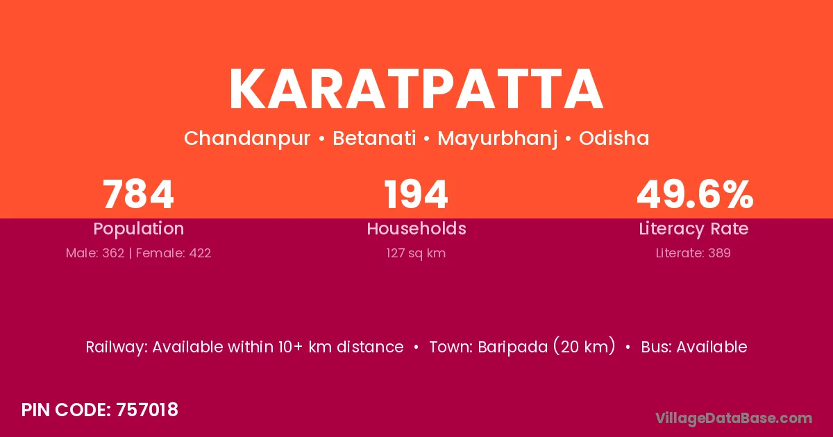 Baripada (20 km) is the nearest town to Karatpatta village for major economic activities and is located approximately 20 km away.