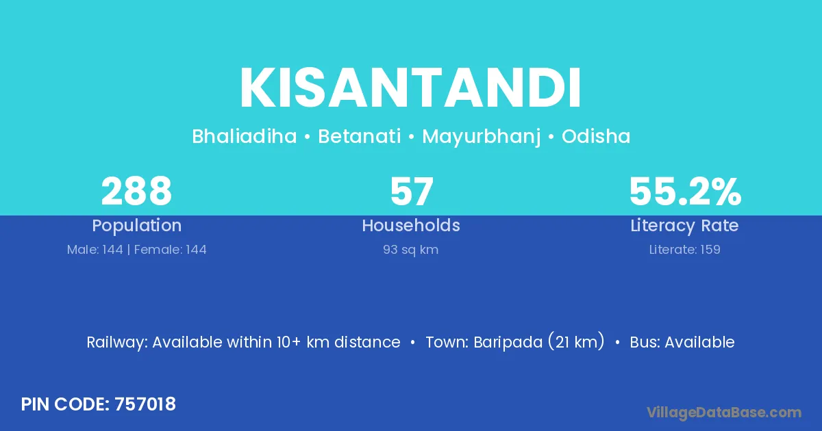 Baripada (21 km) is the nearest town to Kisantandi village for major economic activities and is located approximately 21 km away.