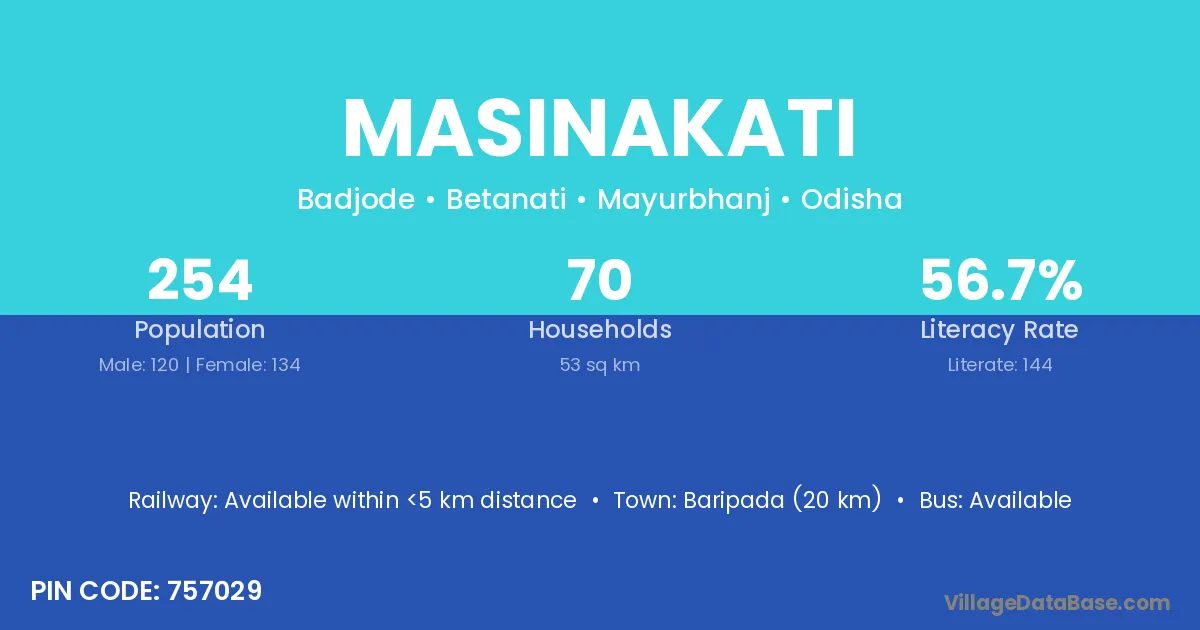 Baripada (20 km) is the nearest town to Masinakati village for major economic activities and is located approximately 20 km away.