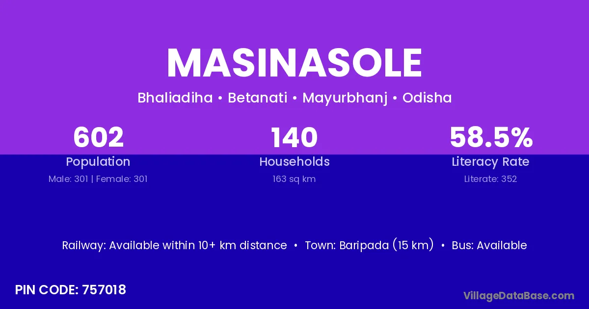 Masinasole village has a total population of 602 people, of which 301 are males and 301 are females.
