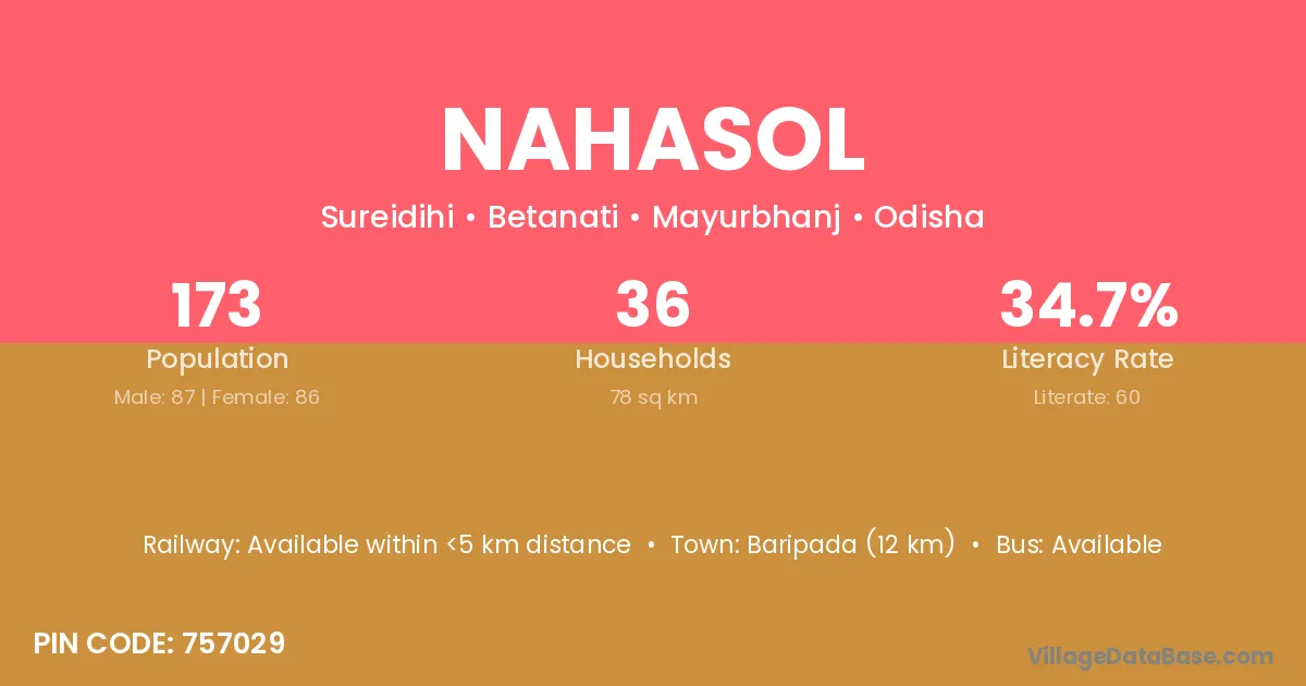 Baripada (12 km) is the nearest town to Nahasol village for major economic activities and is located approximately 12 km away.
