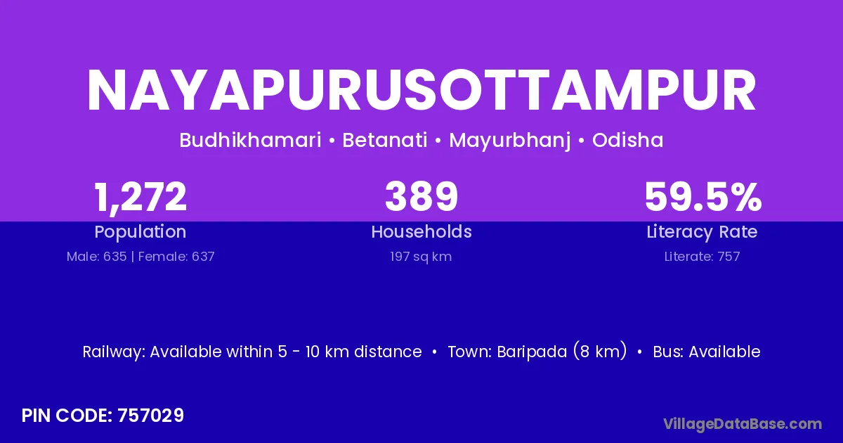 Baripada (8 km) is the nearest town to Nayapurusottampur village for major economic activities and is located approximately 8 km away.