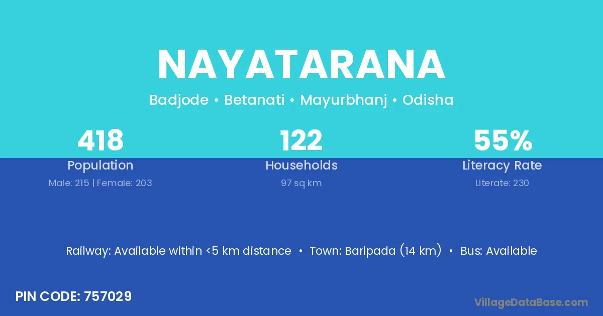 Baripada (14 km) is the nearest town to Nayatarana village for major economic activities and is located approximately 14 km away.