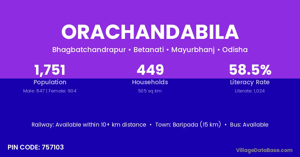 Baripada (15 km) is the nearest town to Orachandabila village for major economic activities and is located approximately 15 km away.