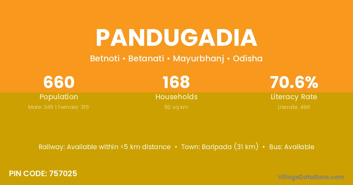 Baripada (31 km) is the nearest town to Pandugadia village for major economic activities and is located approximately 31 km away.