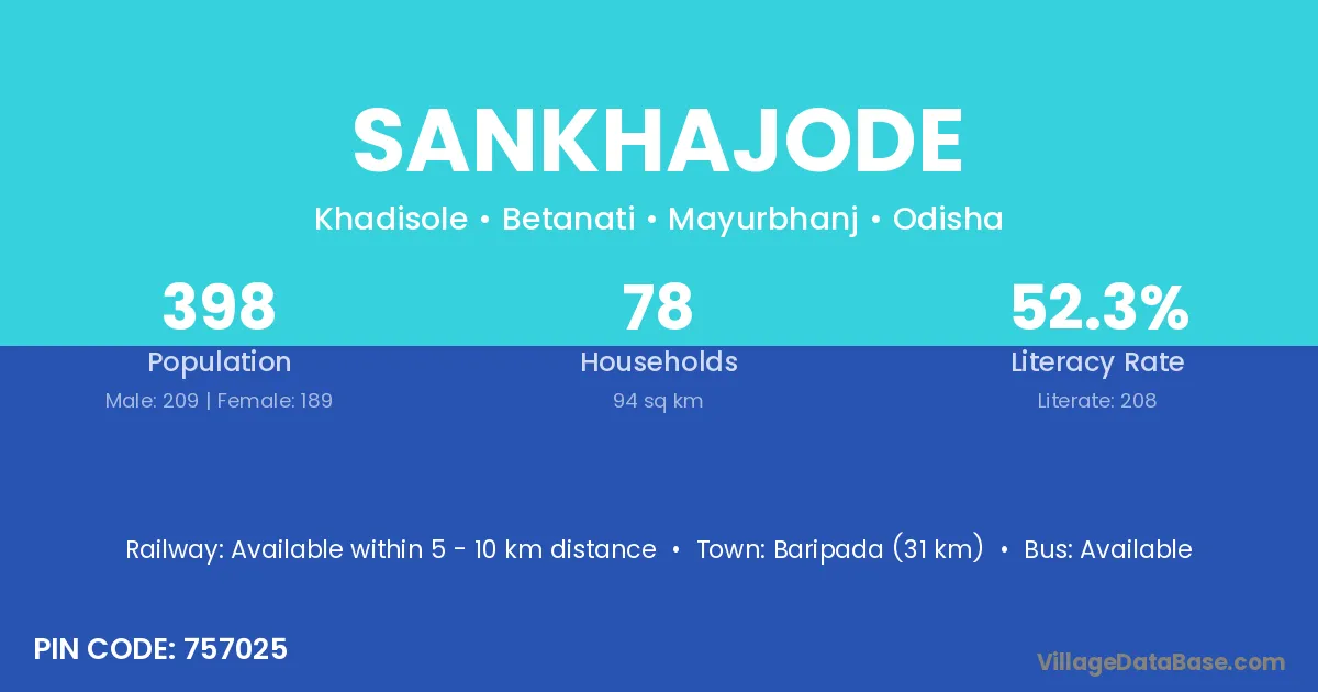 Sankhajode village has a total population of 398 people, of which 209 are males and 189 are females.